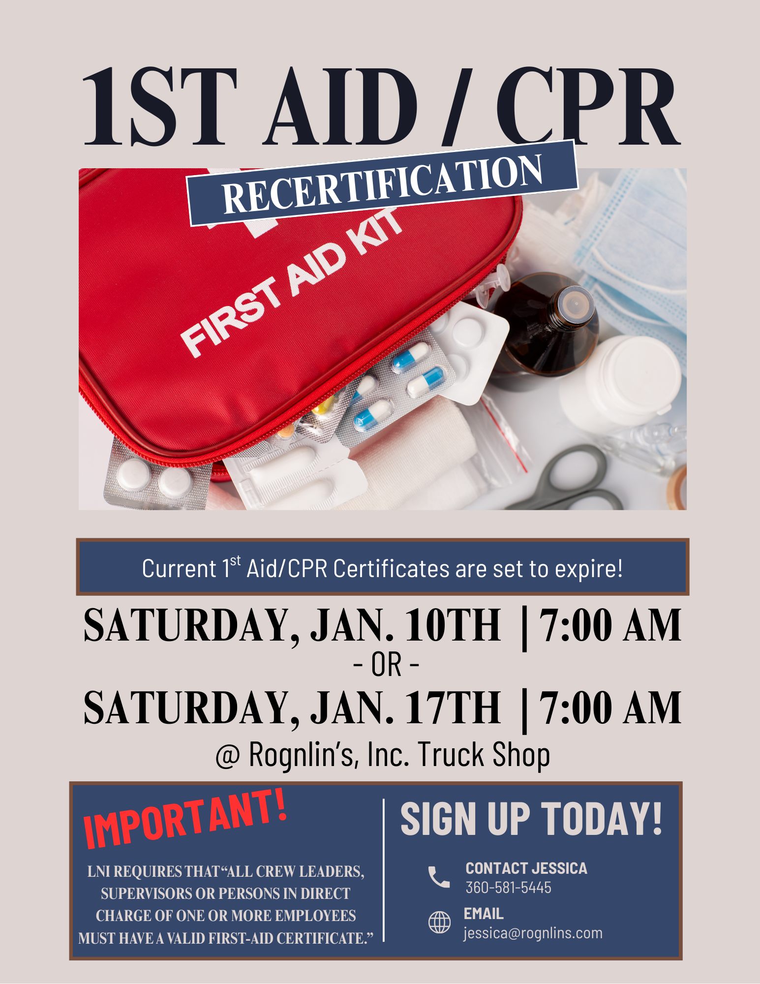 CPR ClassesIf you received training at our last company class, your First Aid and CPR certifications are about to expire. Certifications last 2 years and are available to all Rognlin’s Inc. employees.